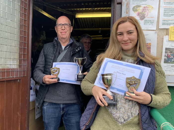 After the AGM we awarded the trophies from this years allotment competition. The winners of the two categories (over and under 18 month occupancy) were Kevin Baskill and Flora Nica, who are pictured with their trophies.