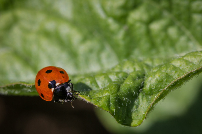 Another keen consumer of aphids is the Ladybird, this particular specimen a 7 spot ladybird, Coccinella Septempnuctata, travelling across one of the potato plant leaves.