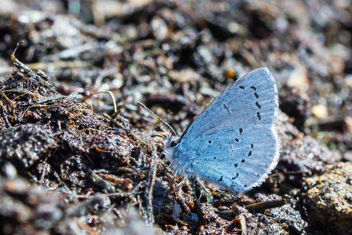 The other new capture was this small blue butterfly which seemed to enjoy the solitude of my raised bed or rhubarb leaves. He / she is a Holly Blue.