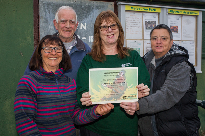 For the third successive occasion Melbourne Park Allotment has been awarded 'the best large site' in the Bi Annual City Council competition. Valerie McCarthy from the Chelmsford City Council kindly spared time to present the certificate today. Receiving the award on behalf of the site were Josie Rawling, Ian Moore and Karen Lawrence.