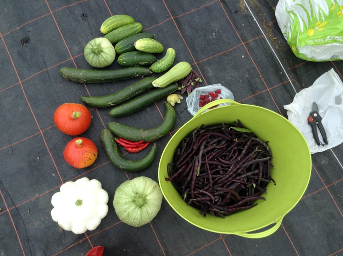 In the raised beds we had flowers for cutting, leaf beet, lettuce, spring onions, beetroot, carrots, peas, mange tout, herbs, raspberries, radishes, a bumper crop of climbing french beans (in one week we picked a total of 25kgs!) however the runner beans were not great. In the spare space within the membraned areas (at ground level) we opened up two patches and grew tomatillos, pumpkins and courgettes. We knew they would grow BIG from the results in 2018 so we made sure had plenty of space to wander around this time. We were watering anywhere between 2 to 4 times a week during the summer as the vegetables were growing away like crazy. Each time we would take home a bag or a sack of harvested fresh goodies. Let’s say we got creative with the gluts! As WI members we try to avoid food waste so our freezers, preserving pans and recipe files got busy … green tomato curry anyone?