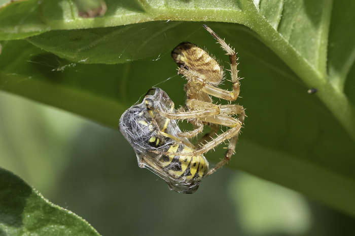 The image featured here is a garden spider carefully, very carefully wrapping up his catch, a wasp. The photograph was taken on the plot next to project 63. Having flown into the spiders quite significant web, the wasp fought for ages before succumbing. I took quite a few photographs of the struggle, and ultimately failed to complete a host of other jobs I set out to accomplish on the day!!