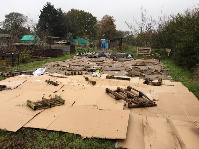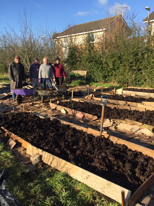 The Belles pictured here have weighted the cardboard layer over the plot, and with the delivery of well rotted manure have now laid out the first four beds with temporary boards, then mulched, all of which forms the starting point for their project.