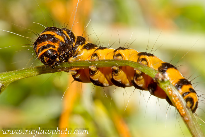 Whilst I have not been down to the allotments with the camera as frequently as previous years, there still remains lots of interesting wildlife to be viewed outside of the hard effort of producing fruit and veg. Last week some folks found a colony of brighly coloured caterpillers which were clustered and feeding voraciously on Groundsal. After a little investigation in turns out that these beasties are in fact the larva of the Cinnibar Moth which develops into a distinctly marked red and black moth.