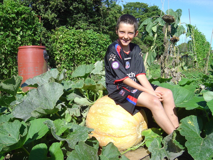 There is already a precedent for a significantly sized pumpkin produced on the site, my son claiming most of the plaudits, although he really just posed with the produce which weighed in at 106lbs, (significantly more than he did) and fed this family of three for several months!! There is only so much soup, crumble, pie and mash that you can tolerate, so ensure that you have a wide circle of friends to feed.